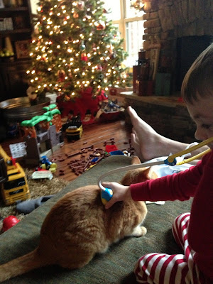 He was sooooo excited... and it was Christmas Eve... and I knew Grandmommy would be even more upset if she thought her precious little man was getting in trouble over opening her presents. So we had a little talk about patience and how opening gifts early makes those that give them sad, and his consequence was not being allowed to take them out of the box to play with until after Grandmommy & Pops arrived. (which was sooooo difficult for him)